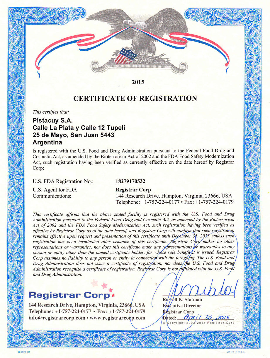 CALIDAD DE EXPORTACIÓN ESTAMOS REGISTRADOS EN LA FDA DE E.E.U.U. VER CERTIFICADO