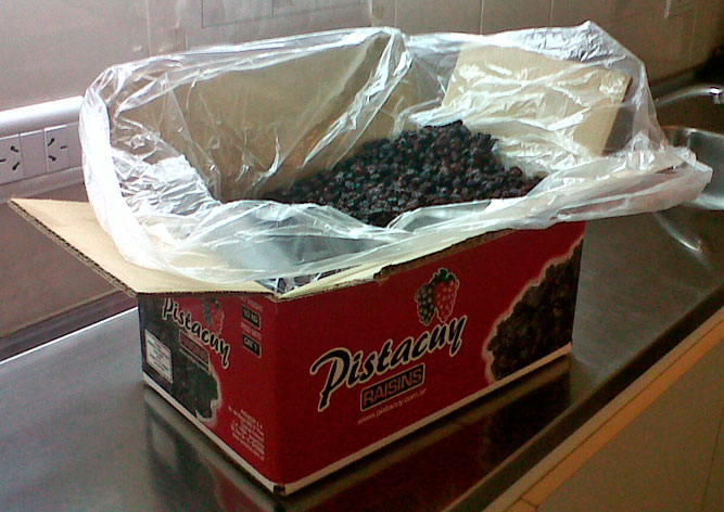 Se envasan habitualmente en cajas de cartón que contienen 10 kg. de pasas de uva, con un plazo de un año de validez para su consumo.